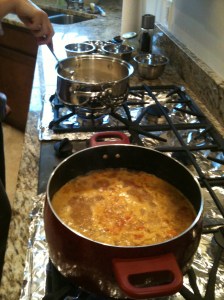 MAKE SURE TO KEEP THE TOP OFF. Boil the mixture for about 25 minutes, and then simmer. You will know it is done when you can push your nail through the carrots.